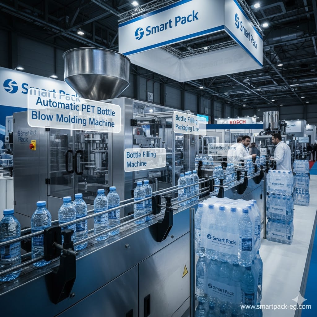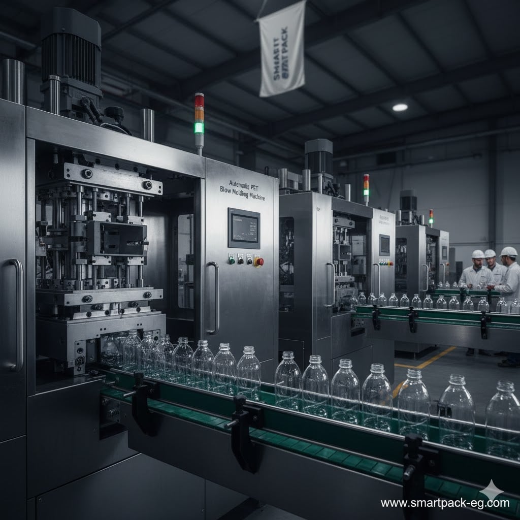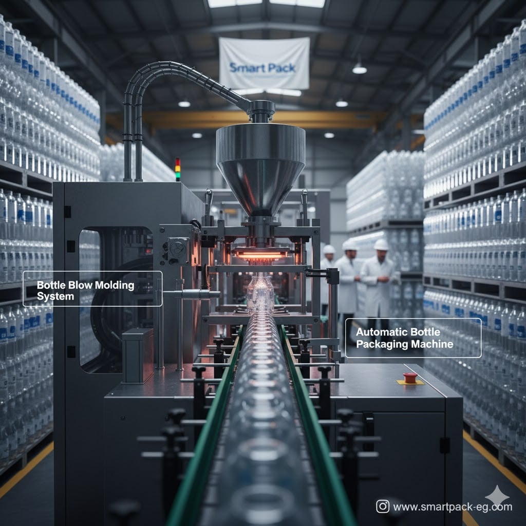 Plastic bottle blowing, filling, and packaging machines perform a fully integrated set of operations, starting from manufacturing the plastic bottle itself (blow molding), then filling it with the product, followed by capping and discharging it automatically onto the packaging line with high efficiency and consistency.
