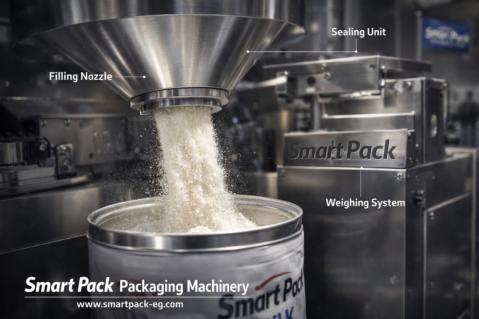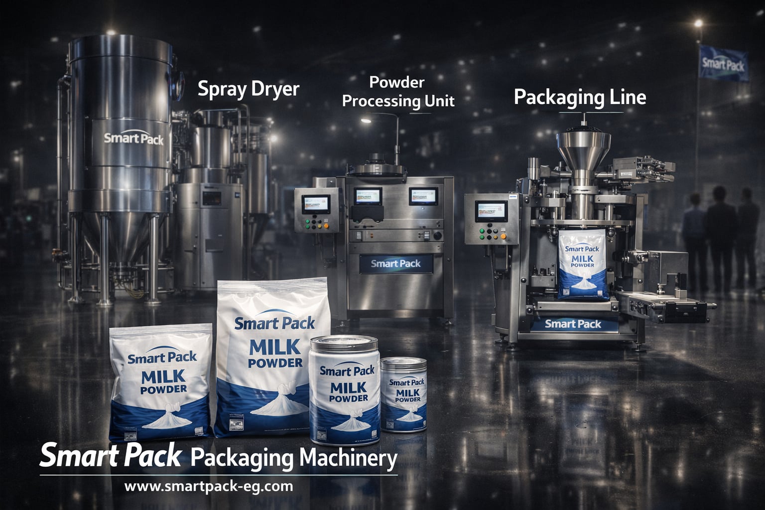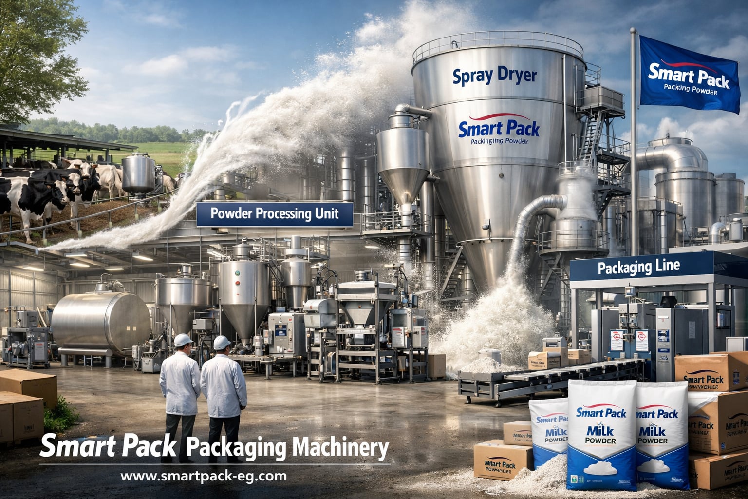بعد الحصول على بودرة الحليب، يتم فرزها ووضعها في وحدات التعبئة باستخدام ماكينات متخصصة لضمان ثبات الوزن وجودة العبوة.