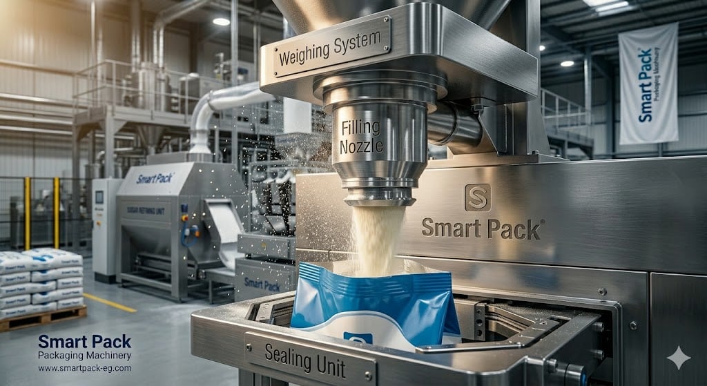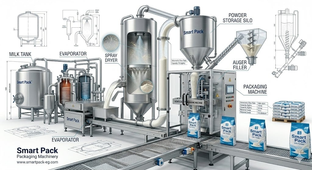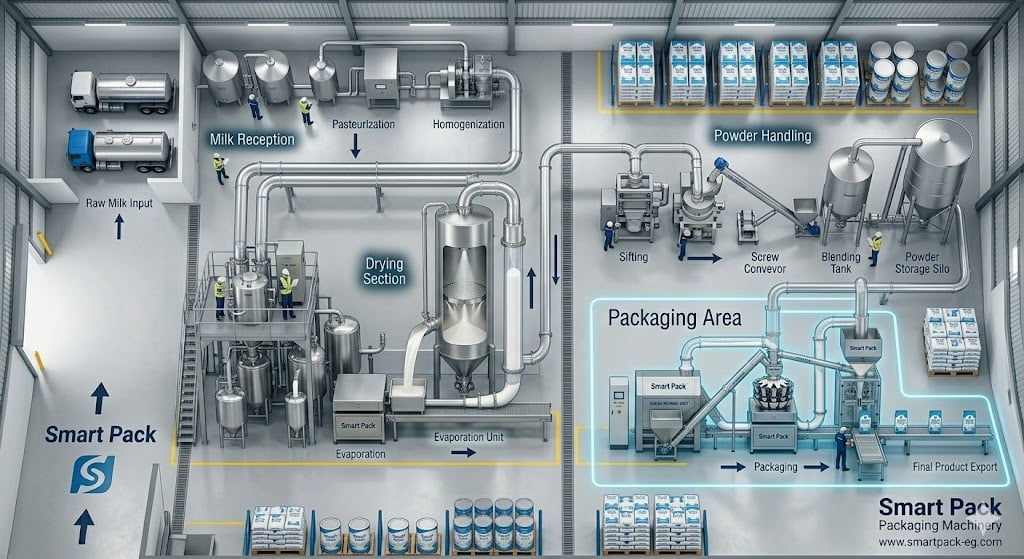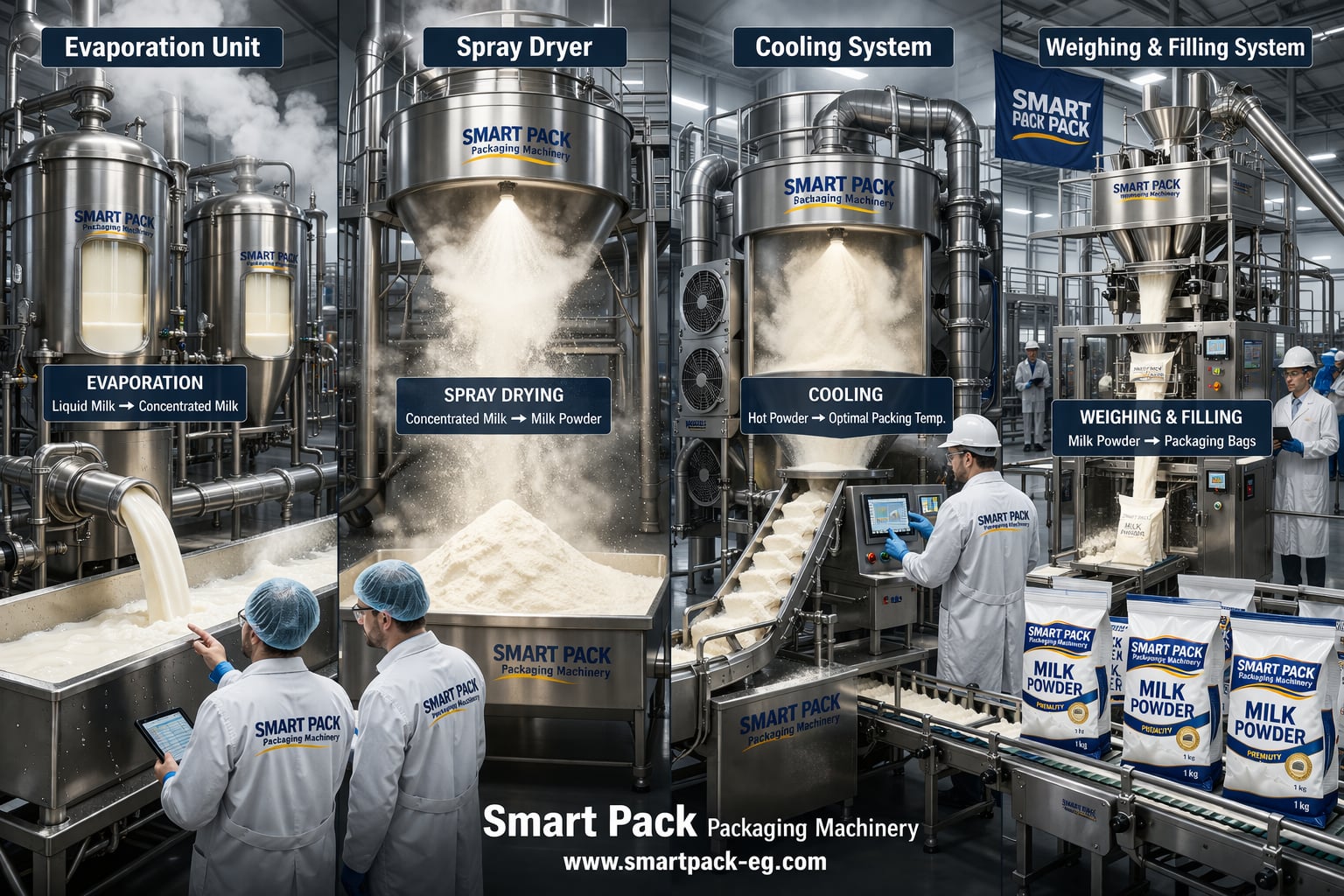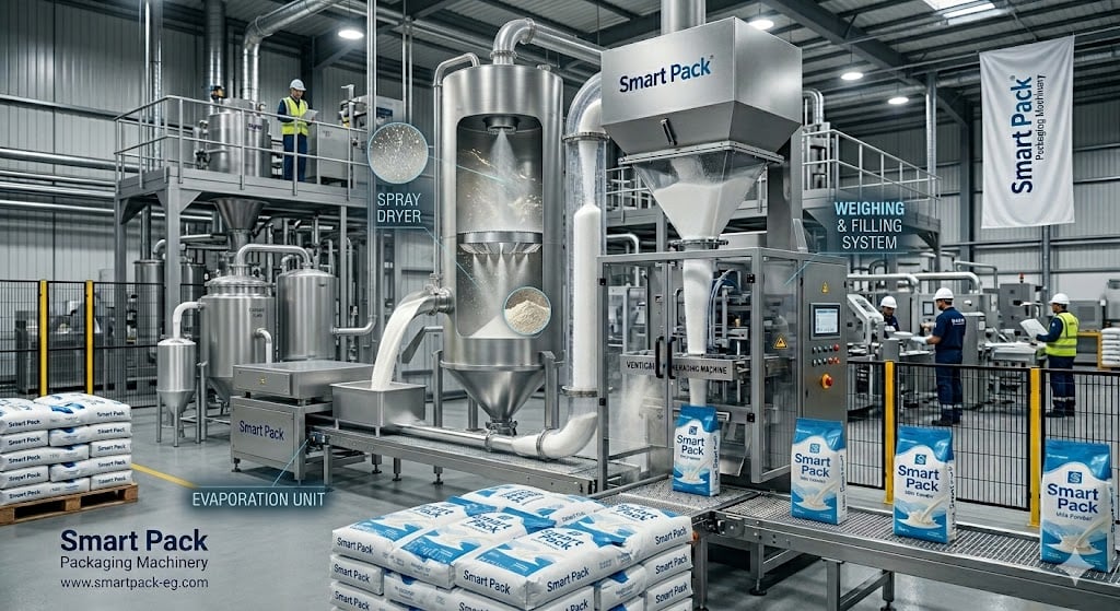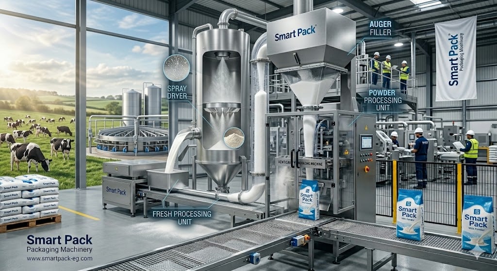 بعد الحصول على بودرة الحليب، يتم فرزها ووضعها في وحدات التعبئة باستخدام ماكينات متخصصة لضمان ثبات الوزن وجودة العبوة.