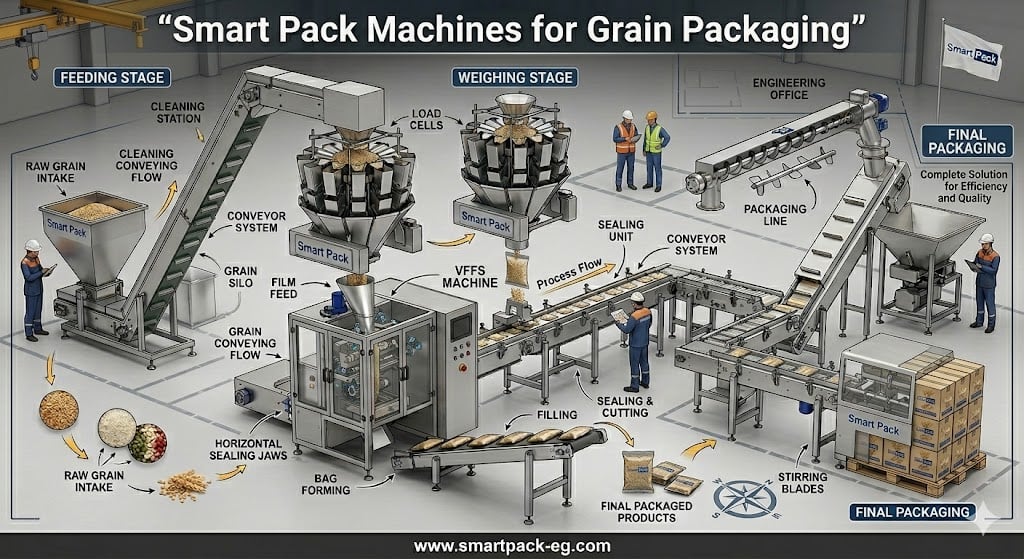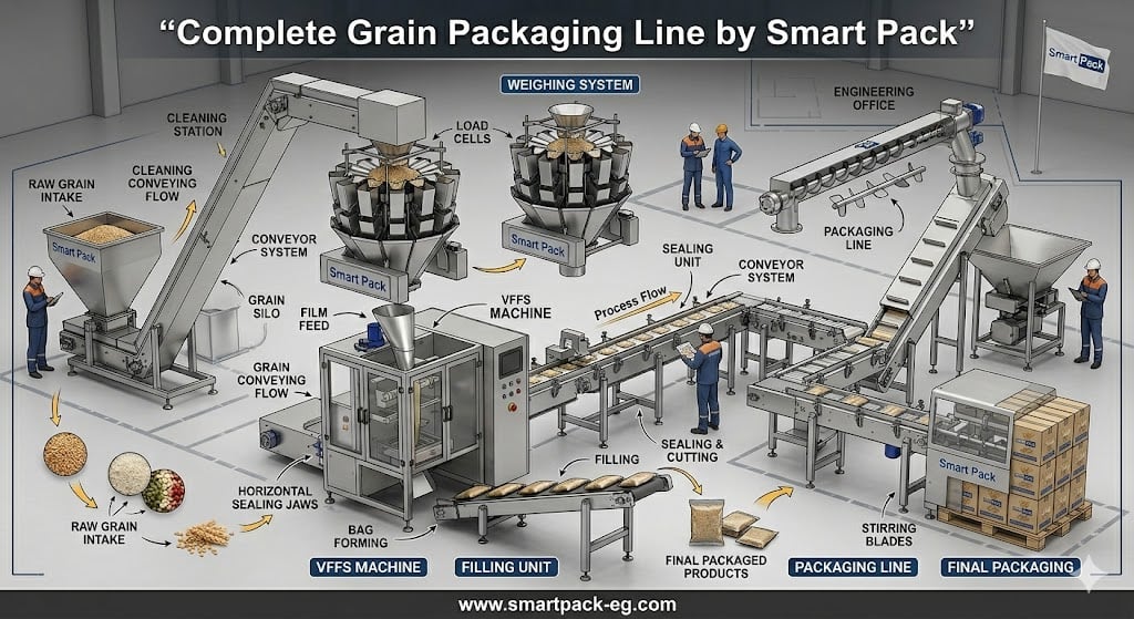 مشروع تعبئة الحبوب يعتمد على تسلسل صناعي منظم يضمن ثبات الجودة وتقليل الفاقد.