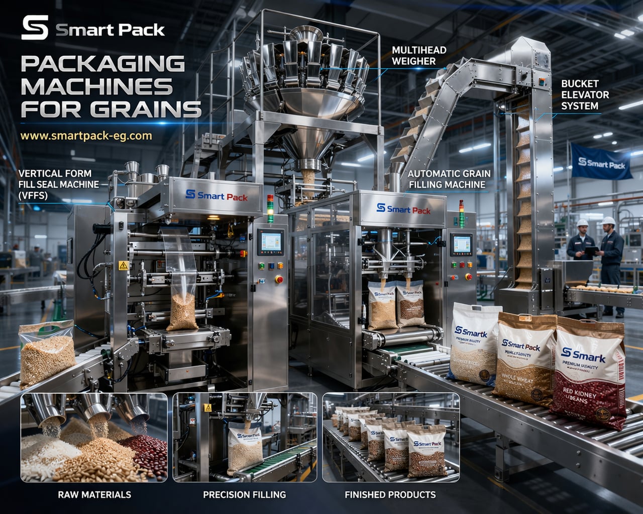 سمارت باك من الشركات المتخصصة في تصميم وتصنيع ماكينات تعبئة و ماكينات تغليف و خطوط إنتاج مخصصة لمشاريع الحبوب ومصانع تعبئة مواد غذائية.