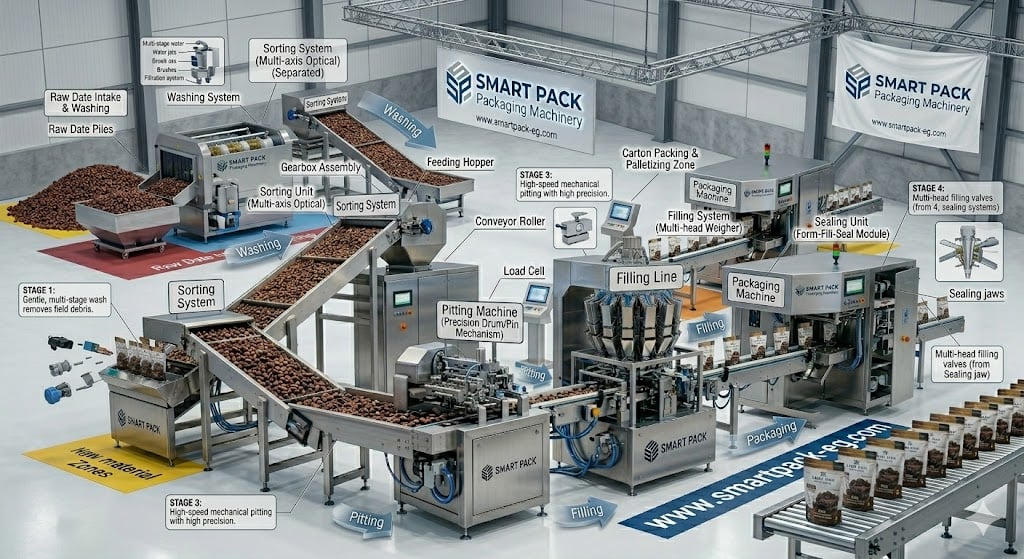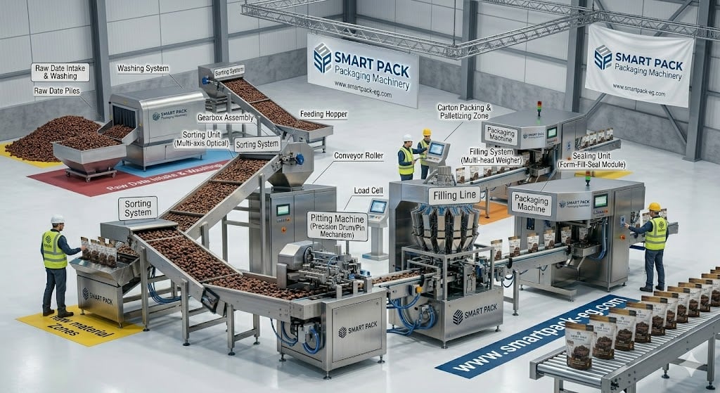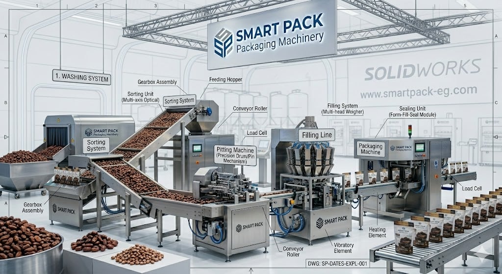 The success of a date packing factory does not depend solely on the quality of raw dates. It relies heavily on the efficiency of production lines, the stability and accuracy of filling machines, and the performance of packaging machines in reducing waste while preserving flavor, texture, and quality until the product reaches the end consumer in perfect condition.