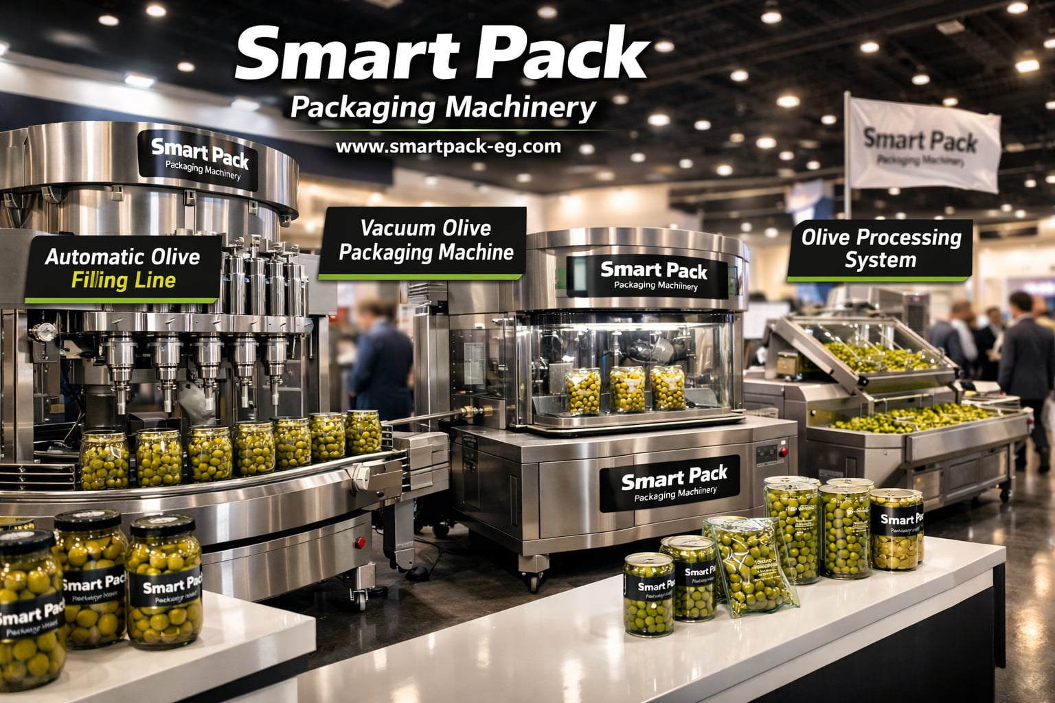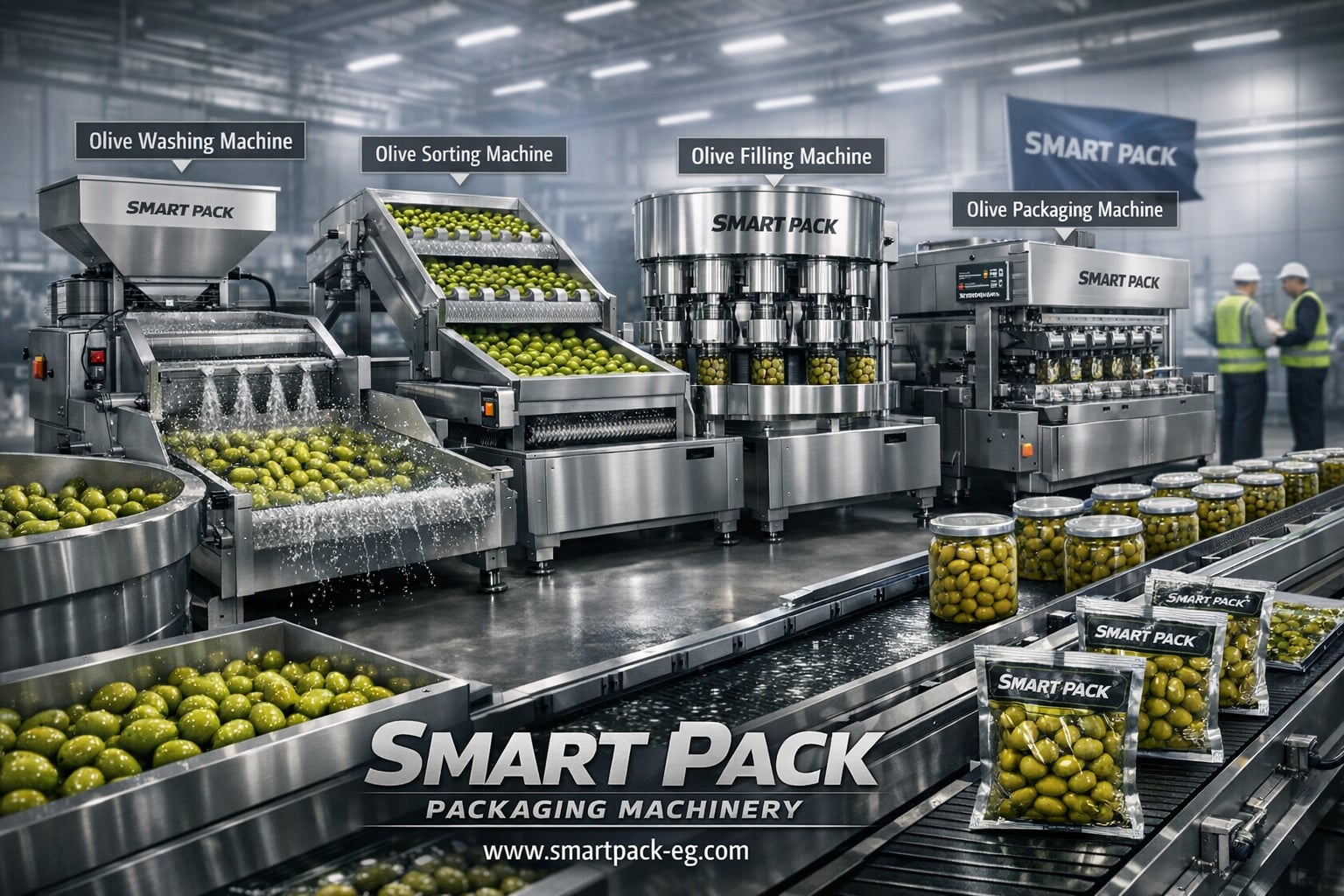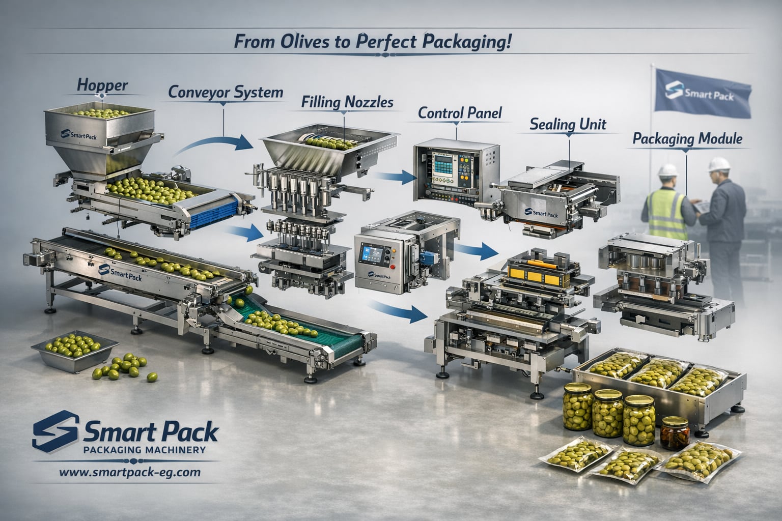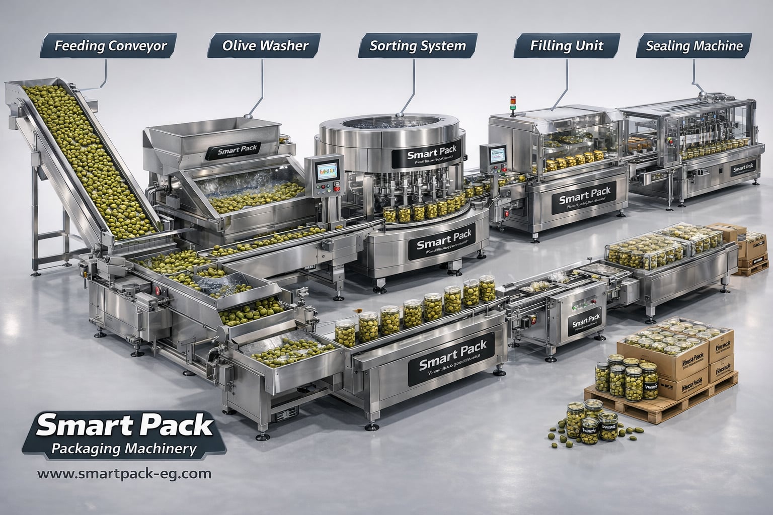 Smart Pack specializes in designing and manufacturing olive filling machines, packaging machines, and complete production lines for olive projects and food packaging factories.
